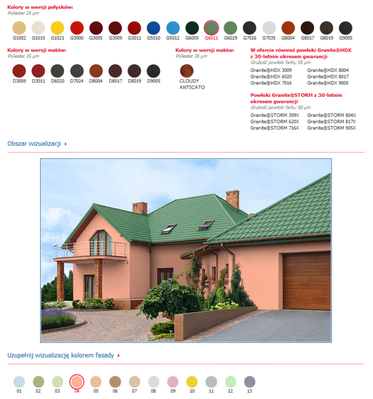 Najpierw należy wybrać kolor dachu z szerokiej palety. Następnie przechodzi się do wyboru kolorów elewacji, dzięki czemu można sprawdzić, jak blachodachówka będzie wyglądała z kolorem elewacji danego domu.