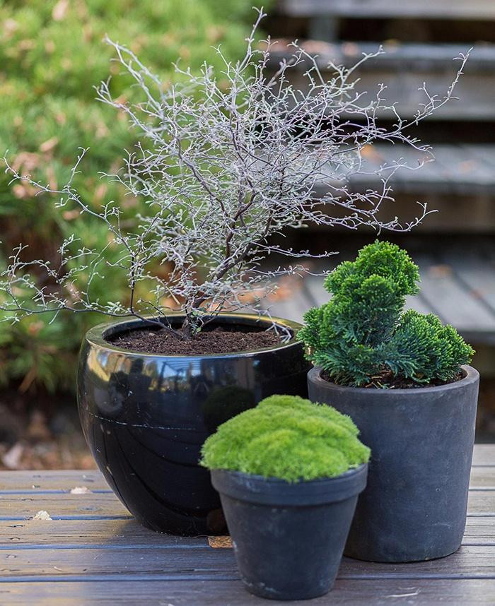 Miłośnicy minimalizmu mogą wybrać jednolicie zielone rośliny o zróżnicowanych teksturach i kształtach. Cyprysik japoński karłowaty i zwyczajny mech stworzą harmonijny zestaw z czarnymi doniczkami i pojemnikami.
