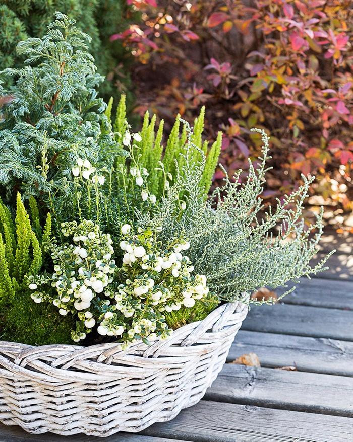 Połączenie różnych odcieni zieleni z białymi dodatkami pozwoli uzyskać efekt soczystej świeżości. Świetnie wyglądać będzie np. zestawienie zielonych wrzosów, wrzosów linii "Skyline", dabecji "Rodeo", cyprysików groszkowych "Boulevard" i pernecji chilijskich.