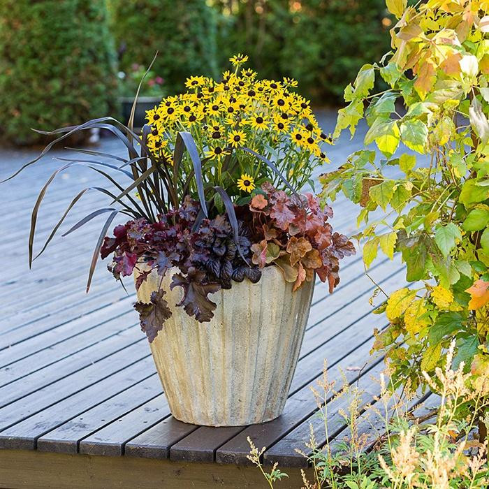 Żółte kwiaty rudbekii błyskotliwej "Goldsturm" nadadzą słonecznej atmosfery i będą kontrastem dla ciemnych liści żurawki. Rośliny dekoracyjne, jak rosplenica perłowa "Purple Majesty" nadadzą całości zrównoważonego i naturalnego charakteru.
