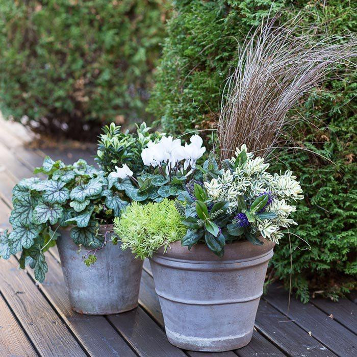 W aranżacjach z mnogością roślin, różnorodność daje czasem lepsze efekty niż jednolite rozwiązania. Nie musi być bujnie - czasem wystarczy tylko kilka roślinek, np. cyklamen perski i hebe. Doniczki i pojemniki stanowią ważny element całości.
