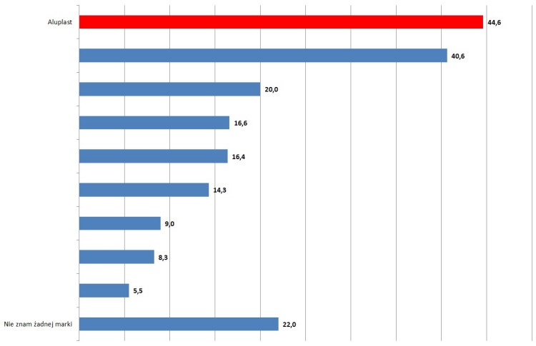 Było to badanie wspomaganej znajomości profili okiennych, gdzie respondenci mieli wskazać znane im marki. Najbardziej rozpoznawalną wśród ankietowanych marką jest ALUPLAST, ze znajomością na poziomie prawie 45%.