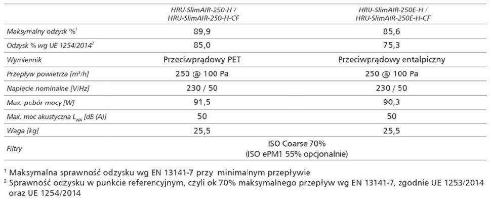 - Odzysk ciepła: HRU-SlimAIR-250-H - do 89,9%, HRU-SlimAIR-250-H-CF - do 89,9%, HRU-SlimAIR-250E-H - do 85,6%, HRU-SlimAIR-250E-H-CF - do 85,6%