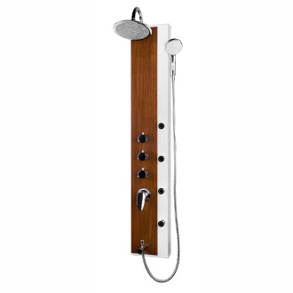 Obudowa panelu natryskowego Cedro wykonana jest z malowanego na biało aluminium połączonego z drewnem teakowym. Dyskretne wzornictwo i zestawienie kolorystyczne elementów pozwalają na wkomponowanie panelu zarówno w nowoczesnych jak i tradycyjnych łazienkach, szczególnie tych z dominującym wykończeniem w naturalnym drewnie. Panel wyposażony jest w 4 boczne dysze masażowe z mosiądzu, deszczownię , zestaw natryskowy ze strumieniami hydromasażowymi oraz wylewkę dolną. Funkcje są załączane niezależnie za pomocą 3 przełączników. W wyposażeniu jest zestaw umożliwiający montaż narożny. Wymiary panelu: 136x22 cm.
