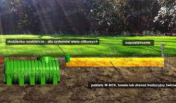Decydującym parametrem jest jakość gruntu. Trzeba więc zlecić przeprowadzenie badania geotechnicznego, żeby sprawdzić właściwości podłoża i jego przekrój, a także poziom wód gruntowych. Zgodnie z przepisami, poziom wód gruntowych powinien znajdować się co najmniej 1,5 m poniżej planowanych rur drenarskich. Jeżeli występują one zbyt wysoko, można wykonać instalację z podniesionym kopcem filtracyjnym i przepompownią.