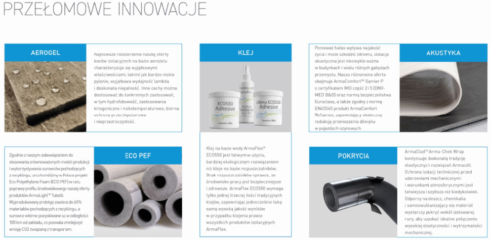 Armacell koncentruje się na materiałach izolacyjnych do urządzeń technicznych, wysokowydajnych piankach do zastosowań akustycznych i lekkich, produktach z recyklingowanego PET, technologii aerożelu nowej generacji oraz biernych systemach ochrony przeciwpożarowej.