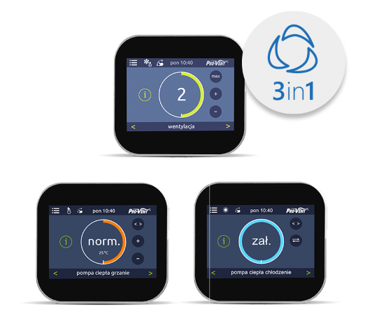 Jeden, intuicyjny manipulator ścienny odpowiada za sterowanie wentylacją, ogrzewaniem powietrznym i chłodzeniem. Centrala wentylacyjna z modułem pompy ciepła HOME PC jest fabrycznie całkowicie okablowana i posiada zabudowaną automatykę. Parametry powietrza i temperatury są wstępnie zaprogramowane, jednak zawsze możesz je modyfikować pod swoje potrzeby.