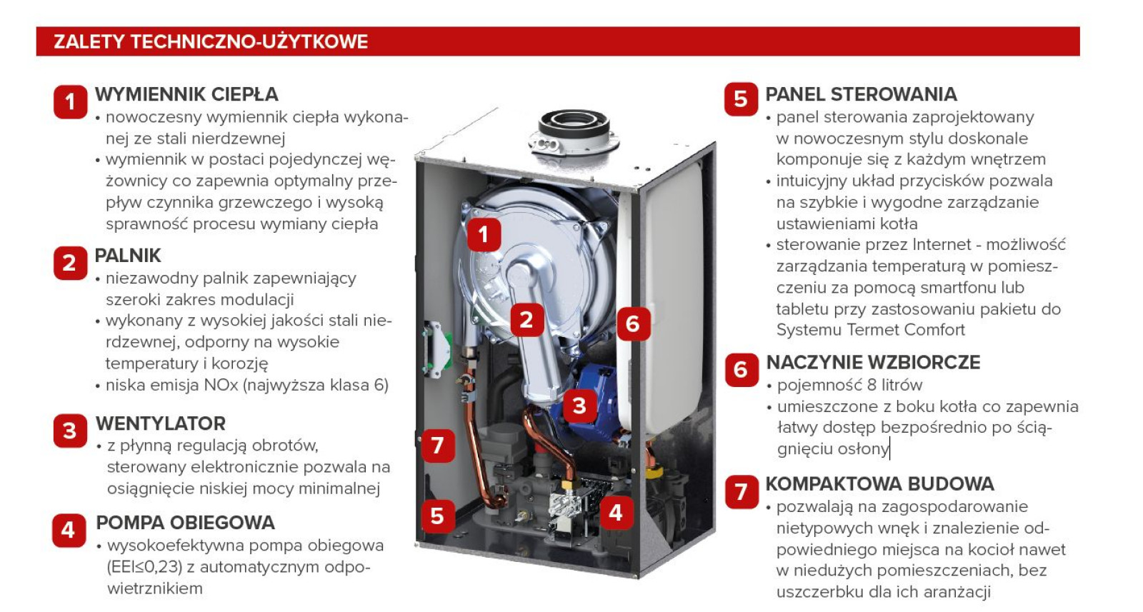 Sprawność do 107%, sezonowa efektywność 94% (klasa A), emisja NOx – klasa 6, poziom hałasu od 48 dB, zdalne sterowanie Termet Comfort, pogodówka i OpenTherm – to nie są dekoracyjne parametry, lecz konkretne liczby, które przekładają się na oszczędność, wygodę i ekologię w realnym użytkowaniu.