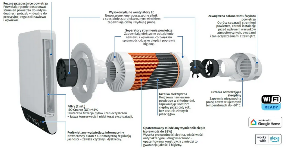 W urządzeniu zastosowano system separacji strumieni powietrza, który eliminuje ryzyko mieszania się nawiewu i wywiewu. Dzięki temu poprawia się zarówno higiena pracy urządzenia, jak i jego ogólna sprawność.