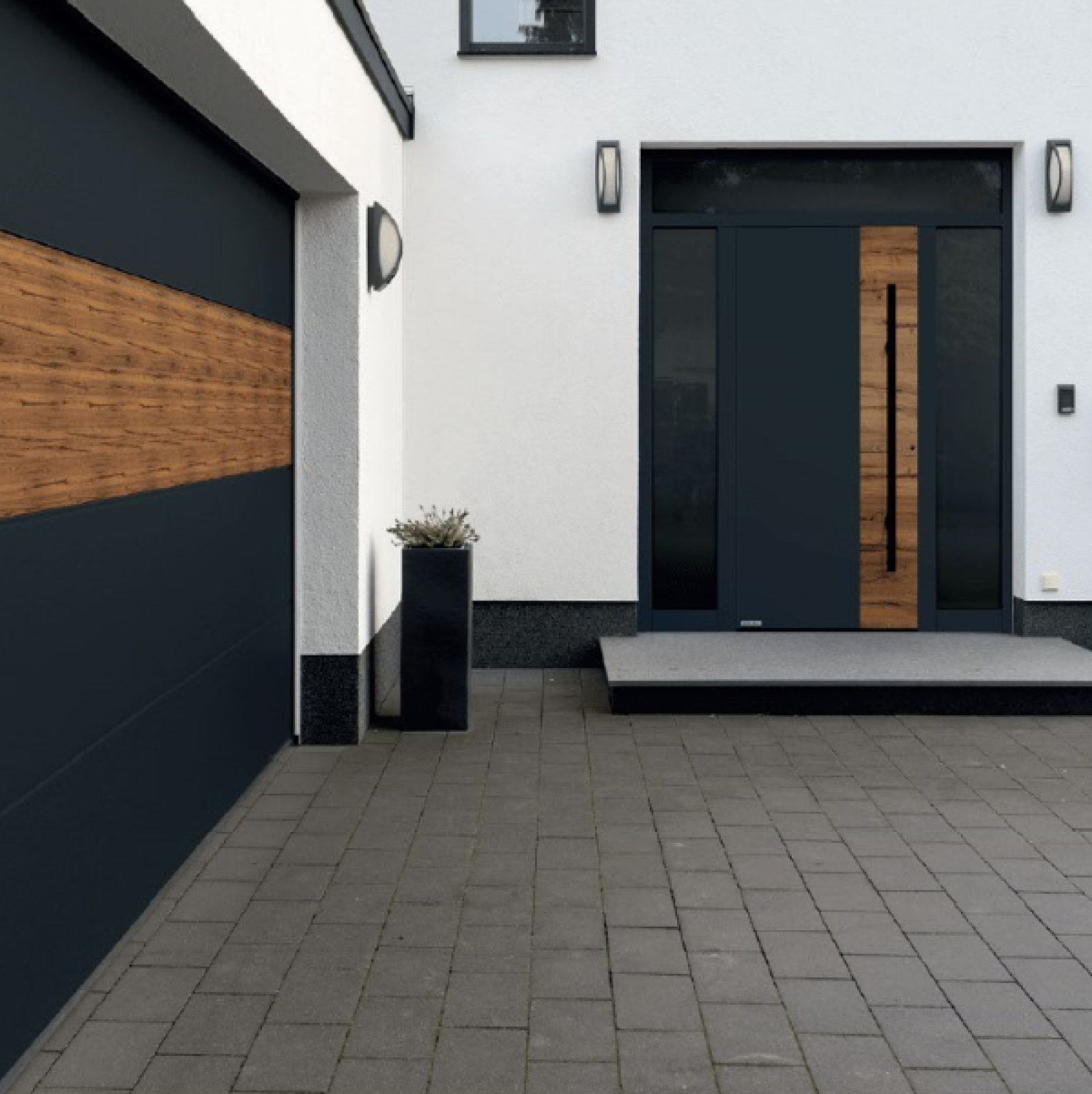 Wyjątkowy efekt aranżacyjny uzyskamy, gdy bramę VarioDesign zestawimy z drzwiami zewnętrznymi ThermoSafe z aplikacjami identycznymi jak w bramie. A dodatkowym atutem takiego rozwiązania jest to, że zarówno brama garażowa, jak i drzwi zewnętrzne marki Hormann są standardowo neutralne pod względem emisji CO2.