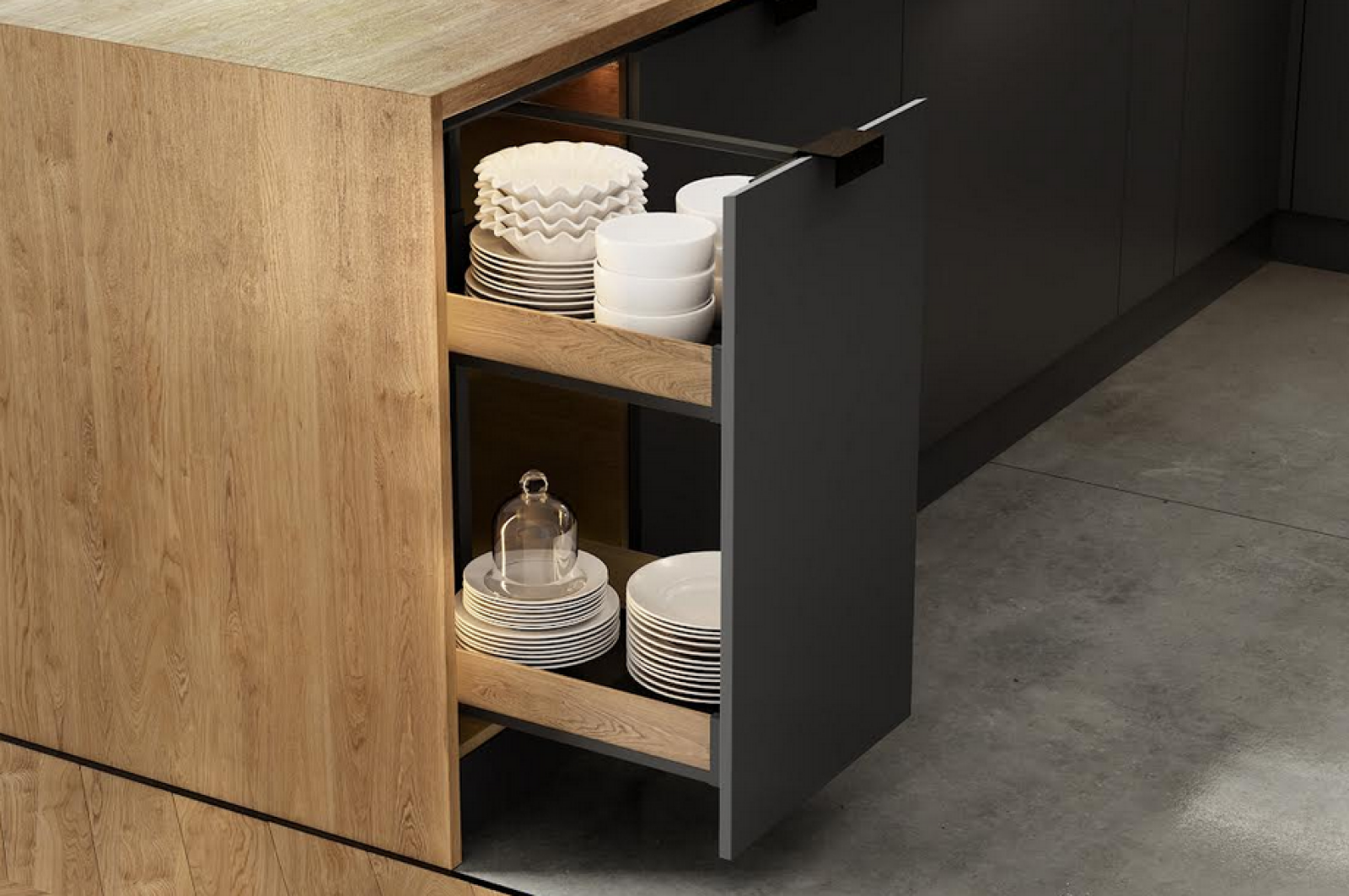 Do szerszych korpusów (60–90 cm), REJS proponuje solidne szuflady, dostępne w dwóch wysokościach: 50 i 80 mm. Te niższe idealnie nadają się do przechowywania drobnych sprzętów AGD, takich jak ekspres do kawy, toster czy robot kuchenny – zapewniając do nich łatwy i szybki dostęp. Szuflady te wytrzymują obciążenie do 40 kg, co czyni je nie tylko funkcjonalnymi, ale i wyjątkowo trwałymi.