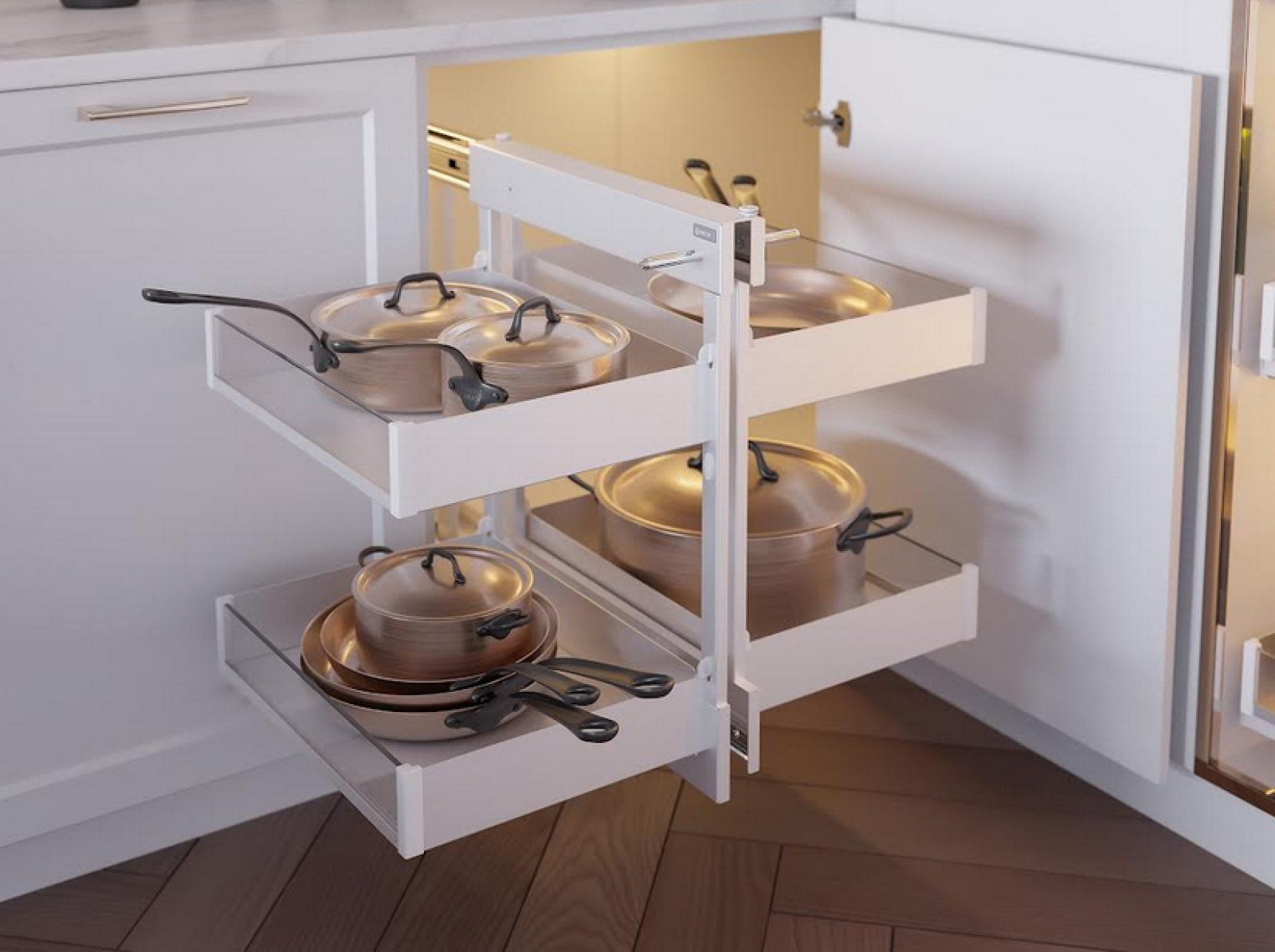 Szczególną uwagę warto zwrócić na systemy do szafek narożnych. Corner Comfort oraz Corner Space Plus eliminują problem trudno dostępnych przestrzeni. Cały mechanizm wysuwa się na zewnątrz wraz z koszami, zapewniając pełny dostęp do zawartości – nawet tej znajdującej się najgłębiej. Oba systemy oferują maksymalne obciążenie na poziomie 25 kg, co przekłada się na ich wysoką funkcjonalność.