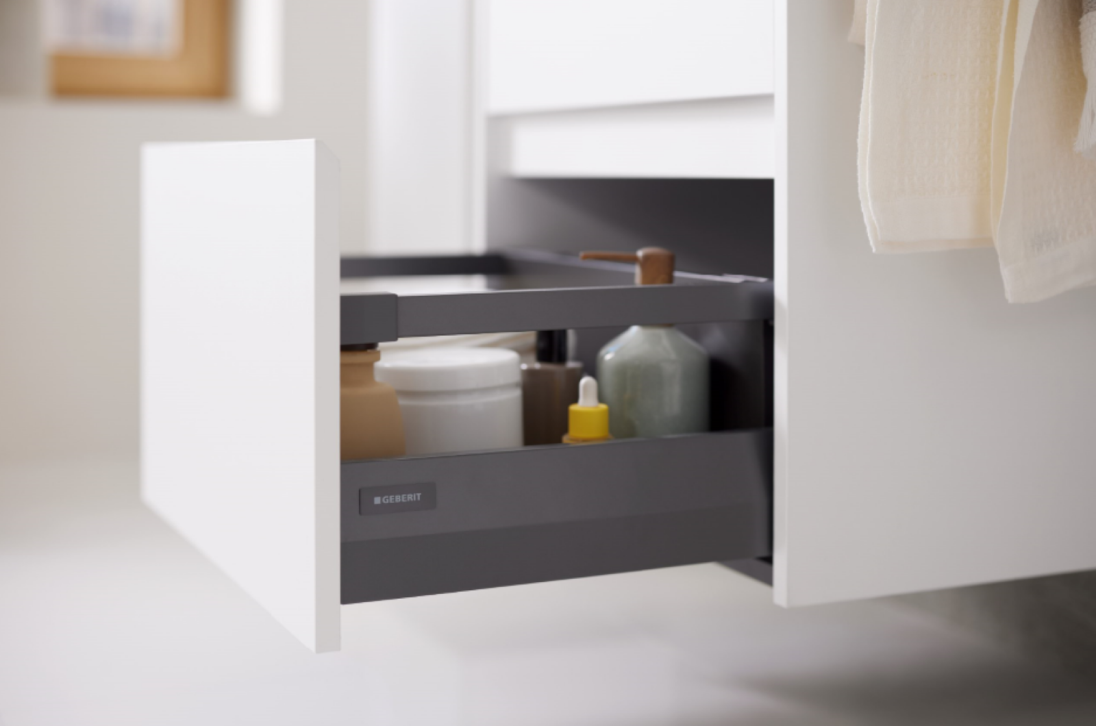 W nowej kolekcji Geberit Selnova Square pojawiły się dwa typy szafek podumywalkowych: węższe modele z drzwiami oraz szersze warianty z dwiema szufladami – oba zapewniające maksymalną przestrzeń do przechowywania. Wszystkie szuflady wyposażono w system cichego domykania oraz eleganckie, ukryte uchwyty frezowane, które podkreślają minimalistyczny charakter mebli i zapewniają wygodę użytkowania.