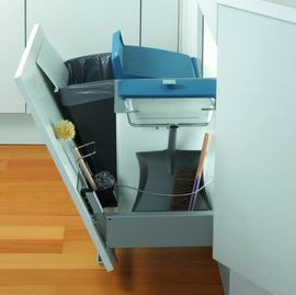 Jeśli chcemy natomiast mieć całkowity dostęp do kosza - wymienić worek, wyciągnąć butelki z płynami do zmywania itp., możemy maksymalnie wysunąć pojemnik i uzyskać optymalny dostęp do wszystkich akcesoriów umieszczonych wokół niego. Jednym z nich jest szklany pojemnik, który może być wyjęty i służyć do zbierania odpadków organicznych, a specjalnie impregnowana torba, zawieszona na panelu dzielącym, posłuży do gromadzenia plastikowych odpadów, puszek, lub makulatury. Po opróżnieniu można ją wyprać tak, aby zawsze pozostawała czysta. Nie można nie wspomnieć też o innych udogodnieniach: osłonie frontu, która zabezpiecza wewnętrzną stronę szafki przed zabrudzeniem, a także specjalnej pokrywie, zapobiegającej przedostawaniu się nieprzyjemnych zapachów.