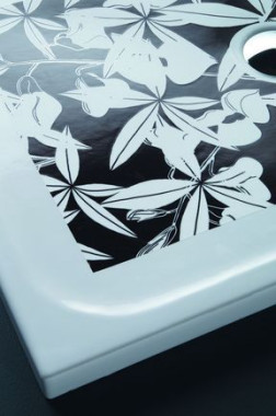 Dekoracja pełni podwójną rolę: ozdobną oraz użytkową, ponieważ jest elementem antypoślizgowym. Oprócz brodzików Filo Pavimento produkowanych w rozmiarach 100x70 cm i 90x90 cm firma Disegno oferuje inne brodziki, utrzymane w romantycznej stylistyce, m.in. z motywem motyla (model Farfalle o wymiarach 180x80 cm).