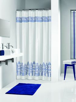 Zasłona Amsterdam, o wymiarach 180x 200 cm, wykonana została z poliestru, kosztuje ok. 95 zł. Do zasłonki można dokupić akrylowy dywanik o wymiarach 60x90 cm z takim samym motywem dekoracyjnym.