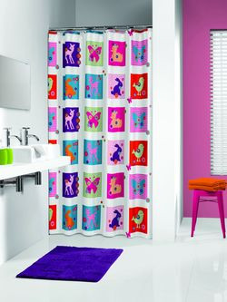 Kolorystyczną przeciwwagą dla obu prezentowanych zasłon jest Bambi Multi. Barwna tkanina z postaciami kolorowych zwierzątek dedykowana jest do dziecięcych łazienek lub takich, z których korzystają dzieci.