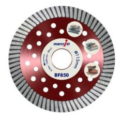 Tarcza diamentowa Marcrist BF850 SilentMax przeznaczona jest do cięcia materiałów budowlanych, elementów wykonanych z betonu, granitu, kamienia naturalnego, a także tych ze stali oraz żelaza. Tarczę można używać do cięcia na sucho i na mokro. Wysokość segmentu tego modelu wynosi 12 mm. Seria tarcz BF oferuje doskonałą relację ceny do wydajności i żywotności, a co za tym idzie bardzo niski wskaźnik kosztu jednego cięcia.