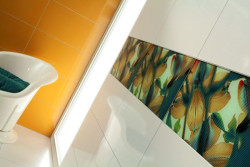 Coll to bukiet w dwóch odsłonach. Wyraziste kwiaty o miodowych płatkach otoczone liśćmi w intensywnym odcieniu cadet blue, wprowadzą do pomieszczenia nastrój budzącego się do życia ogrodu. Takie połączenie kolorystyczne nie tylko rozświetli naszą łazienkę, ale pozwoli nam zatrzymać ciepłe dni na cały rok.