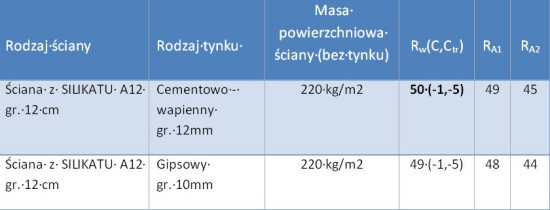 Dodatkowymi atutami bloczków SILIKAT A12 są: jego dokładność T2, która pozwala na budowanie na cienką spoinę, a także wysoka klasa odporności ogniowej. Ściana grubości 12 cm wykonana z SILIKATU A12 zapewnia nośność, szczelność i izolacyjność ogniową przy bezpośrednim działaniu ognia przez dwie godziny - REI 120. Tabela 1. Parametry akustyczne ścian z SILIKATU A12 na podstawie zestawienia wartości wskaźników izolacyjności akustycznej ścian przygotowanego przez Zakład Akustyki ITB (wersja uaktualniona maj 2013).