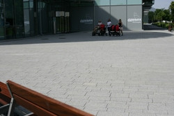 Kostki nie mają bocznych faz, dzięki czemu ułożone z nich nawierzchnie są szczególnie komfortowe, zarówno dla użytkowników pojazdów na małych i większych kółkach jaki i pań na wysokich obcasach. To, co czyni te kostki tak eleganckimi to warstwa szlachetnych kruszyw, delikatnie mieniących się w słońcu, nadających kostkom stonowany kolor: solaro, granito lub bianco carrara. Warstwa kruszyw ma jeszcze jedną zaletę, którą docenimy po deszczu, a także zimą - zapewnia kostkom antypoślizgowość. Na zdjęciach kostki Via Castello w kolorze granito w otoczeniu Pomorskiego Parku Naukowo-Technicznego w Gdyni.