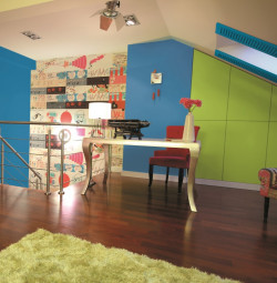 Domowe miejsce do pracy niczym współczesna, klimatyczna galeria? Lazurytowy błękit, soczysta zieleń, nasycona czerwień tworzą prawdziwą eksplozję koloru, a intensywne dodatki i grafika w stylu książkowych ilustracji podkreślają wyjątkowość aranżacji. Taka oryginalność twórczo pobudza umysł, dowodząc, że styl pracowni nie musi być nudny i statyczny.