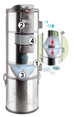 - filtracji cyklonicznej - specjalne kolano wlotowe (1) wprawia wpadające do jednostki powietrze w ruch cykloniczny, rozdzielając frakcje kurzu.