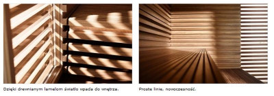 Projekt oświetlenia w tym rozwiązaniu zasługuje na szczególną uwagę. Zewnętrzne światło dzięki drewnianym lamelom zamontowanym na szybach sauny pośrednio wpada do wnętrza, powodując, że osoby korzystające z sauny są niewidoczne. Która sauna chroni bardziej Twoją prywatność?