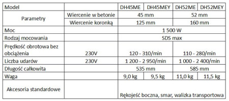 Cztery nowe urządzenia o symbolach DH45ME, DH45MEY, DH52ME oraz DH52MEY to całkowicie nowe konstrukcje młotów. Najbardziej innowacyjnym elementem konstrukcyjnym tych elektronarzędzi jest bezszczotkoy silnik sieciowy. Jako pierwsza firma na świecie w branży elektronarzędzi firma Hitachi wykorzystała tą technologie do napędu młotowiertarek sieciowych. Nowoczesne wysokowydajne silnik bezszczotkowe to przede wszystkim zdecydowane wydłużenie żywotności napędu elektronarzędzia.
