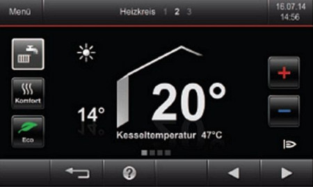 Kocioł Vitodens 300-W można obsługiwać zdalnie, bezprzewodowo, przez zintegrowany interfejs radiowy. Służy do tego radiowa jednostka zdalnej obsługi Vitotrol 300 RF. Duży, kolorowy ekran dotykowy z przejrzystym układem pól obsługowych jest prosty w obsłudze. Z ekranu dotykowego Vitotrol 300 RF można wybierać program roboczy, temperaturę zadaną pomieszczenia, tryb oszczędny, program wakacyjny i program tygodniowy indywidualny dla każdego z maksymalnie trzech obiegów grzewczych. Przy przyłączonej instalacji solarnej na ekranie przedstawiany jest również graficznie uzysk ciepła z kolektorów słonecznych.