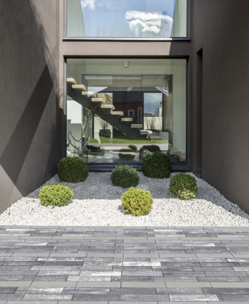 Do nawierzchni wykonanej z kostki Metrik warto dodać spójne wyglądem obrzeża lub palisady. Będą stanowić ramy kompozycyjne deptaka, alei czy podjazdu i oddzielać ciągi piesze od zieleni. Do tego celu nadają się utrzymane w tonacjach szarości i dedykowane nowoczesnej architekturze obrzeża Polbruk Modern, Flesz czy palisady Zen lub Hestra.
