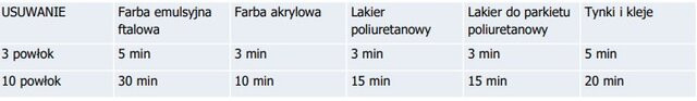 Rozmiękczoną powłokę delikatnie usuwa się szpachelką, a całość czyścimy ciepłą wodą i twardą szczotką nylonową. Nową warstwę dekoracyjną można nałożyć po upłynięciu 24 godzin.