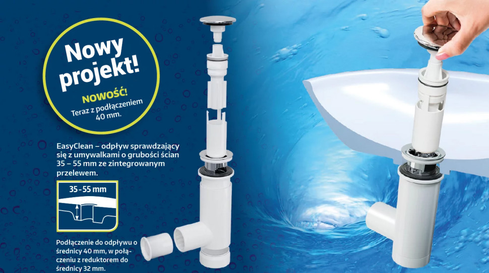 EasyClean – odpływ sprawdzający się z umywalkami o grubości ścian 35-55 mm ze zintegrowanym przelewem