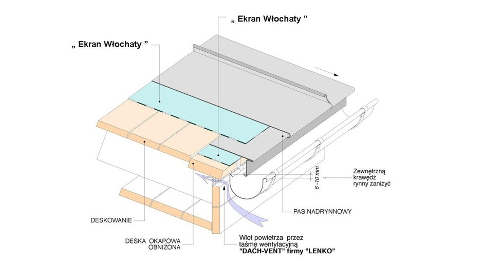 Ta para wodna skrapla się pod blachą i spływa w dół. Jest jej mało i dlatego proces skraplania i odparowywania może się powtarzać wielokrotnie zanim skroplina opuści dach spływając w okapie (rys.). Ekran nie przepuści wody do środka w stronę poszycia (desek, płyt wiórowych lub sklejki).