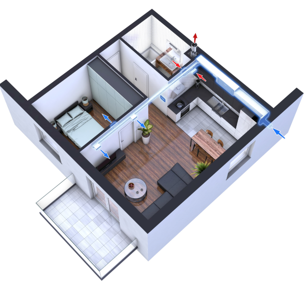 Rozwiązaniem jest indywidualna wentylacja mechaniczna z odzyskiem ciepła. Dzięki systematycznemu i kontrolowanemu dopływowi świeżego powietrza do pokoi oraz jednoczesnemu usuwaniu zużytego powietrza z kuchni, łazienek i WC, zapewnia: