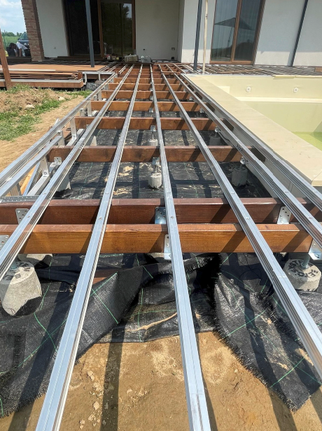 Co z kompozytami? Tutaj zwykle przewidziano rozstaw od 30 do 40 cm osiowo. Do WPC polecane są przeważnie legary kompozytowe i drewniane (o parametrach C24 impregnowane ciśnieniowo lub egzotyczne). Warto jednak rozważyć najtrwalsze rozwiązanie, czyli nowoczesne systemowe legary aluminiowe. Dzięki niemu otrzymujemy sztywną podkonstrukcję, która nie lęka się wilgoci. Właściwie użyty system legarowania Gardin jest bezobsługowy i nie wymaga żadnej dodatkowej troski w przyszłości.