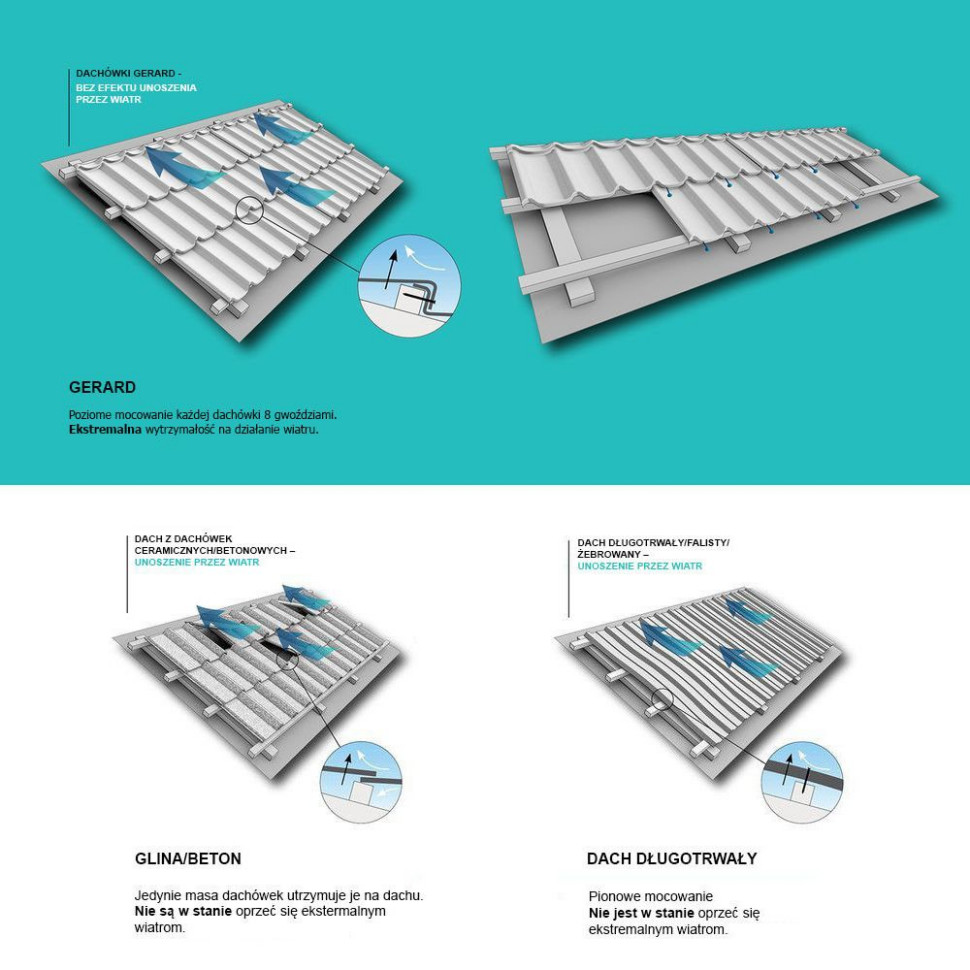 Firma GERARD zastosowała rewolucyjne rozwiązanie, montując każdy element w poziomie, w aż 8 punktach. Dzięki temu każda dachówka jest solidnie przymocowana do łat konstrukcji za pomocą specjalnych śrub i gwoździ. Ten sposób montażu "resetuje" podmuchy wiatru, niwelując ich niszczycielskie oddziaływanie.