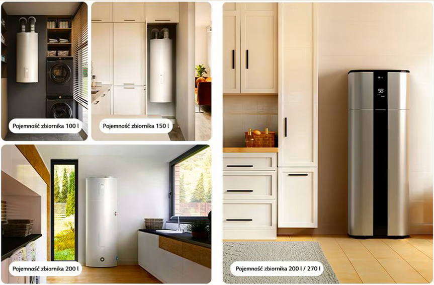 Rozmieszczenie urządzenia nie powinno być przypadkowe. Montaż w wersji Monoblock pozwala na prostsze osadzenie w mieszkaniu lub domu, bez konieczności prowadzenia skomplikowanych instalacji. W praktyce masz do wyboru modele okrągłe o pojemnościach 100, 150 i 200 litrów oraz modele kwadratowe o pojemnościach 200 i 270 litrów.