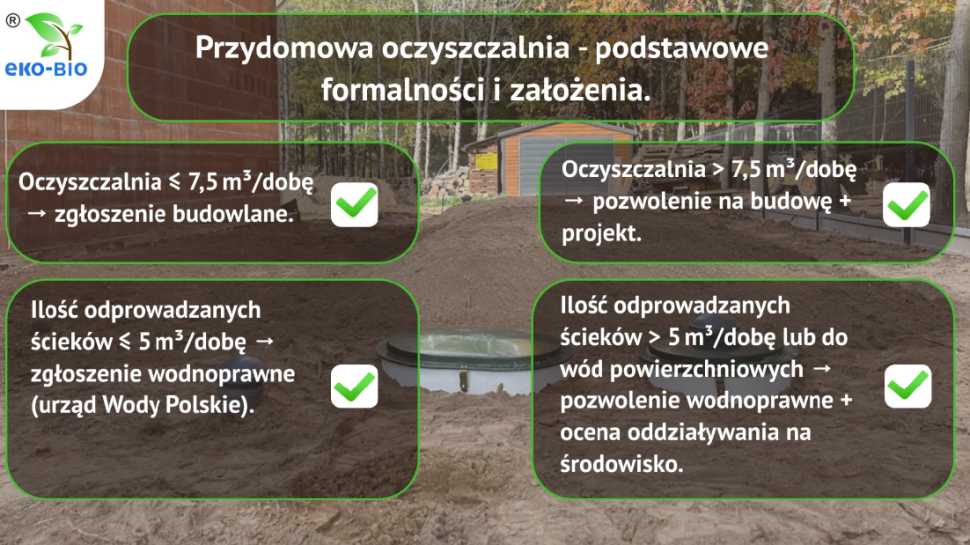 Natomiast dla oczyszczalni o przepustowości przekraczającej 7,5 m³ na dobę konieczne staje się uzyskanie pozwolenia na budowę, przygotowanie projektu budowlanego i przejście pełnej procedury administracyjnej wynikającej z Prawa budowlanego.