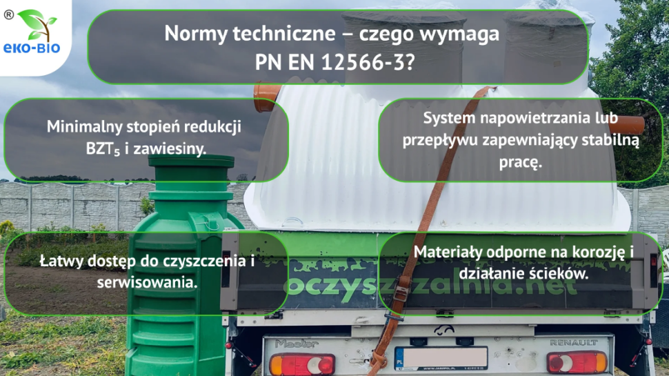 Projekt i wykonanie przydomowej oczyszczalni ścieków muszą odpowiadać rygorom technicznym opisanym w PN EN 12566-3. System powinien zawierać szczelny osadnik, właściwy układ komór biologicznych oraz skuteczny system napowietrzania lub przepływu, które zapewniają stabilne warunki pracy.