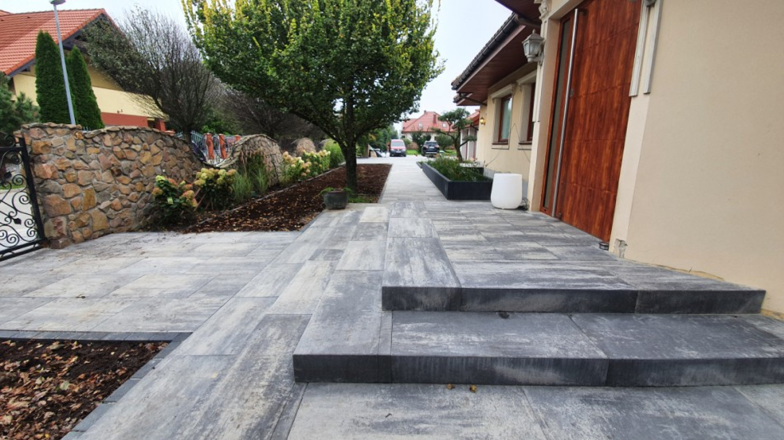 W nowoczesnych realizacjach dużą popularnością cieszą się wielkoformatowe płyty betonowe, które ograniczają liczbę spoin i poprawiają komfort poruszania się po nawierzchni. Ich dodatkowym atutem jest uporządkowany, elegancki wygląd. W estetykę współczesnych domów dobrze wpisują się między innymi płyty Polbruk Magna oraz Polbruk Bosso Mezzo.
