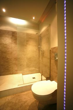 Projektując oświetlenie, nie możemy zapominać o łazience. Tu potrzebne jest dużo jasnego, ale niezbyt jaskrawego i zimnego światła. W łazience ważne jest zarówno oświetlenie ogólne, sufitowe (centralne lub punktowe), jak i tzw. „zadaniowe”, czyli np. bezpośrednio przy lustrze.