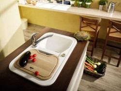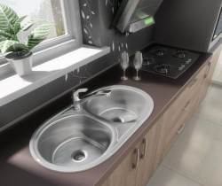 Dobrym rozwiązaniem jest też zamontowanie dwukomorowego zlewozmywaka, np. produktu Duet firmy Deante. Jego pojemne, położone symetrycznie komory pozwalają na swobodną pracę dwóch osób – mama może obierać warzywa w jednej, a dziecko myć je w drugiej. Uniwersalne, zaokrąglone kształty zlewozmywaka pozwolą maluchowi bez problemu dosięgnąć baterii czy sięgnąć po zmywak.