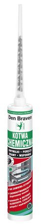 Kotwa chemiczna firmy Den Braven jest dwuskładnikową, chemoutwardzalną i szybko twardniejącą alternatywą dla stosowanych powszechnie kołków lub kotw rozporowych. Stworzona na bazie żywicy poliestrowej i nie zawierająca szkodliwego styrenu, doskonale sprawdza się podczas kotwienia elementów konstrukcjach budowlanych. Dzięki wyjątkowej łatwości użycia, może ona być stosowana zarówno przez profesjonalistów jak i amatorów domowych prac budowlanych – wystarczy jedynie zwykły pistolet do kartuszy, robocza końcówka mieszająca (dostarczana razem z produktem) oraz wiertarka, i już możemy trwale i pewnie zamocować antenę satelitarną, tablice pamiątkową, markizę, zawiasy bramy, okiennice, muszlę klozetową, ekran LCD, kwietnik czy wiele innych drobnych elementów, do których do tej pory potrzebna byłą interwencja specjalisty.