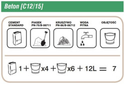 Przygotowanie mieszanki betonowej polega na ręcznym lub mechanicznym wymieszaniu zawartości worka z kruszywem, piaskiem i odpowiednią ilością wody. Zalecana kolejność dodawania składników to: kruszywo, piasek, 2/3 części wody, cement, pozostała część wody do wymaganej konsystencji. Mieszanka betonowa zachowuje swoje właściwości użytkowe przez około 2 godziny.