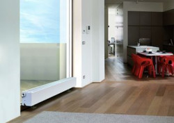 Marka Purmo w swojej ofercie posiada zarówno standardowe grzejniki płytowe dostępne w wysokości już od 20 cm (z łatwością zmieszczą się pod nisko umieszczonym oknem) jak i dekoracyjne grzejniki Kos H i Faro H nadające wnętrzu niepowtarzalny styl. Z kolei przy całkowicie przeszklonej ścianie polecane są grzejniki kanałowe Purmo Aquilo – ukryte w podłodze zminimalizują straty ciepła spowodowane przez dużą powierzchnię szyby. Przy montażu grzejników zachowujmy odpowiednie odległości od podłogi i parapetu - muszą one wynosić nie mniej niż 10 cm.
