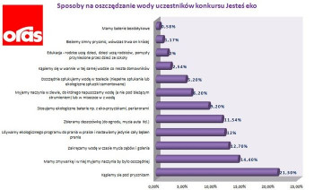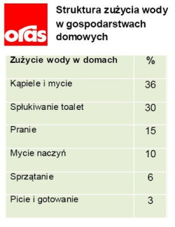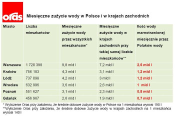 Jak pokazują wyliczenia przeprowadzone przez firmę Oras, światowego lidera w produkcji inteligentnej armatury ekologicznej, to my sami w dużej mierze przyczyniamy się do szybkiego ubywania zasobów wód powierzchniowych i podziemnych przez codzienne marnotrawienie wody. W przypadku niemal 2 milionowego miasta, jakim jest Warszawa, jest to aż 2,6 mld litrów rocznie. Dla porównania mieszkańcy krajów Europy Zachodniej, którzy wykształcili postawy ekologiczne, zużywają średnio o 50 litrów wody na dobę mniej. Gdyby mieszkańcy Warszawy obniżyli zużycie wody do poziomu przeciętnego mieszkańca krajów zachodnich jej miesięczne zużycie obniżyłoby się o 2,6 mld litrów. Dla porównania w basenie olimpijskim mieści się ok. 3 mln l wody – zaoszczędzoną wodą można by więc wypełnić tysiąc takich basenów.