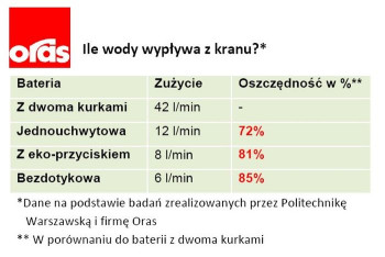 Zasoby świeżej wody w Polsce wynoszą zaledwie 1 700 m³ na jednego mieszkańca. Dla porównania w Finlandii jest to 20 700 m³ na osobę. Dodatkowo w ciągu najbliższych lat ceny wody w niektórych miejscowościach mogą wzrosnąć o 400%. Jak wynika z raportu firmy Oras, światowego lidera w dziedzinie produkcji ekologicznej armatury, do obecnego deficytu wody przyczyniamy się my sami, tak samo jak brak opadów.
