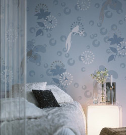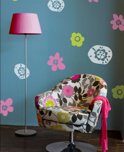 Dekoracje ścienne wykonane z zastosowaniem różnych szablonów, wypełnijmy zatem barwami z tej samej tonacji, subtelnie zróżnicowanymi – unikniemy w ten sposób wizualnego chaosu.