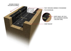 W tak przygotowanym wykopie układamy zbrojenie. Zbrojenie musi być otoczone warstwą betonu o grubości minimum 5 cm (otulina zbrojenia). Należy więc dopilnować aby pręty zbrojeniowe znajdowały się w odległości nie mniejszej niż 5 cm od folii – na dole należy użyć podkładki dystansowe.
